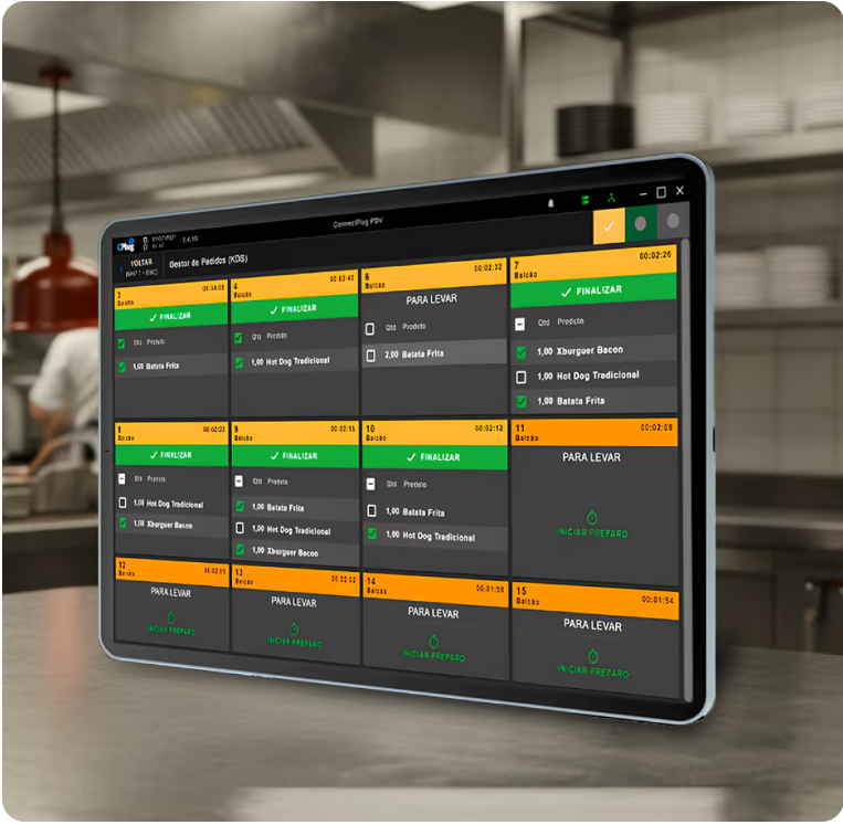 Com o KDS (Kitchen Display System) da CPlug, os pedidos chegam diretamente à cozinha em tempo real, eliminando erros e otimizando o preparo. Ela substitui os tradicionais pedidos impressos, mostrando os pedidos em uma tela visível para a equipe da cozinha. A comunicação entre a cozinha e o atendimento nunca foi tão rápida e eficiente!